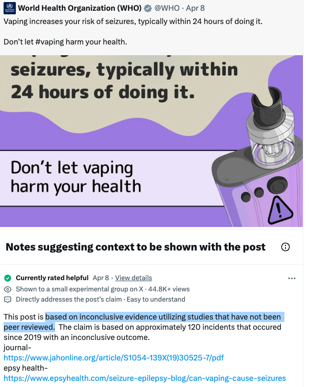 We called for a Community note to be added two days after the post was made, and Community Notes responded in classic style. In case you’re wondering, the actual number based on the same data for those under 19 was around one fifth of what the Lung Foundation claimed.