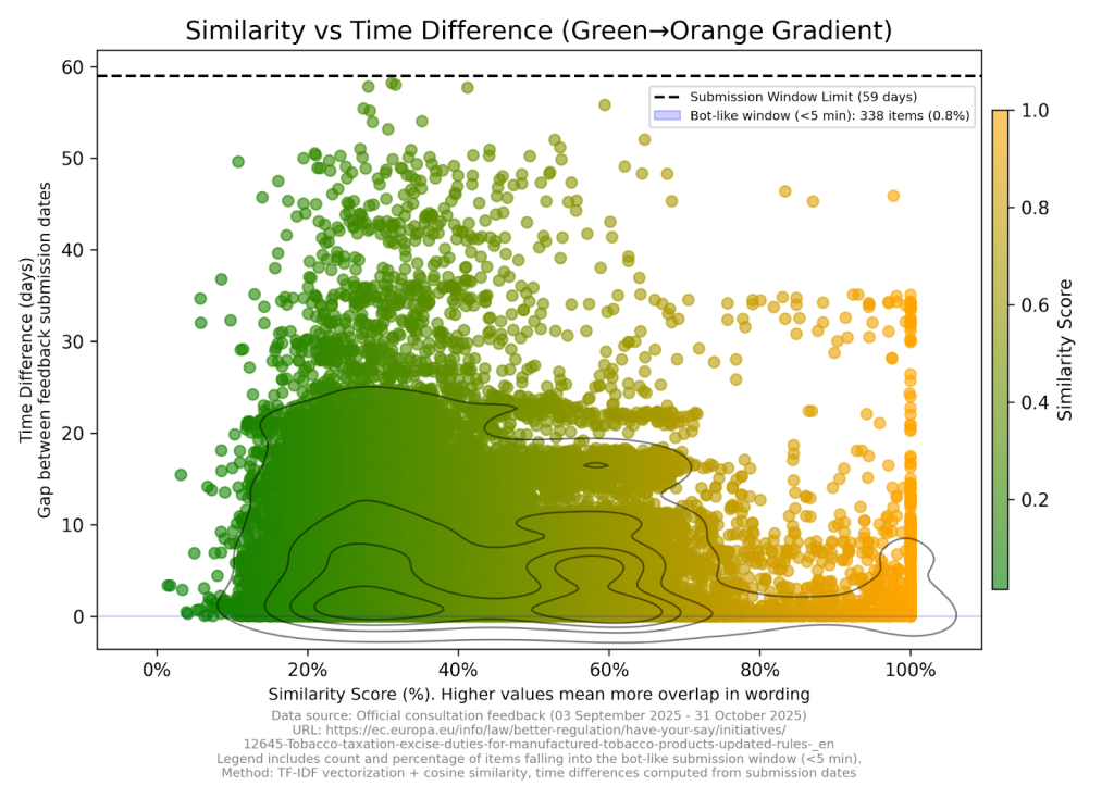 Pero, por si acaso, hicimos un análisis bot. Lo más obvio que hacen los robots es repetir el mismo texto una y otra vez. Así que Hans creó un script para filtrar las entradas en hojas separadas y filtrar cosas sin sentido como «ver archivo adjunto» y calcular la similitud. Al examinar el texto presentado en el idioma del cartel original, vemos que el texto que más veces se repite es 11, con un tiempo entre ellos de 174317 segundos, es decir, 48 horas.
