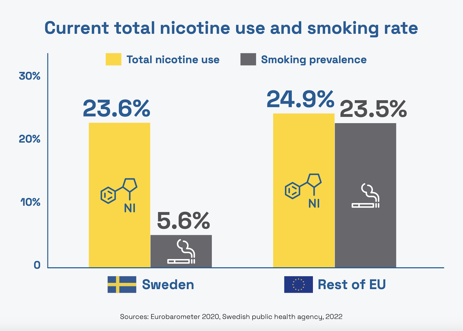This stark contrast is attributed to the widespread adoption of smoke-free nicotine products such as snus, nicotine pouches and vapes.