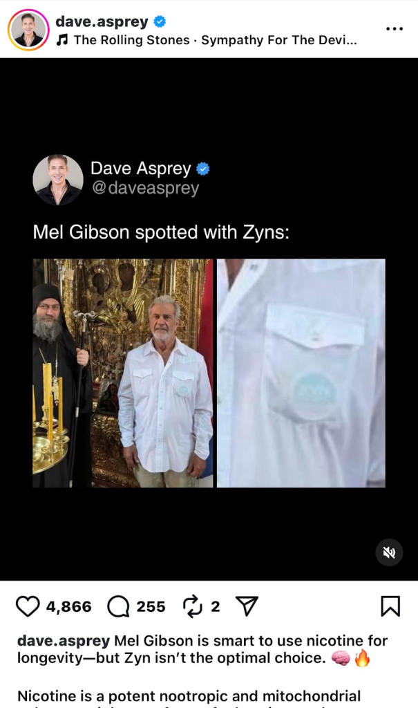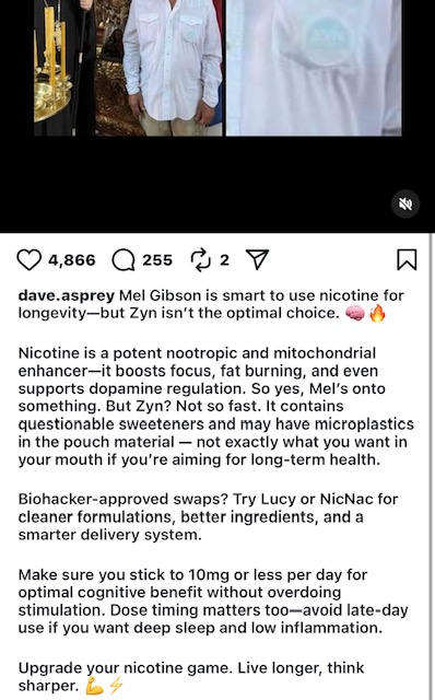 En juin, l’entrepreneur et biohacker Dave Asprey a partagé sur son compte Instagram des photos de Gibson avec des sachets de nicotine – un peu comme les clichés du match contre la Roma.