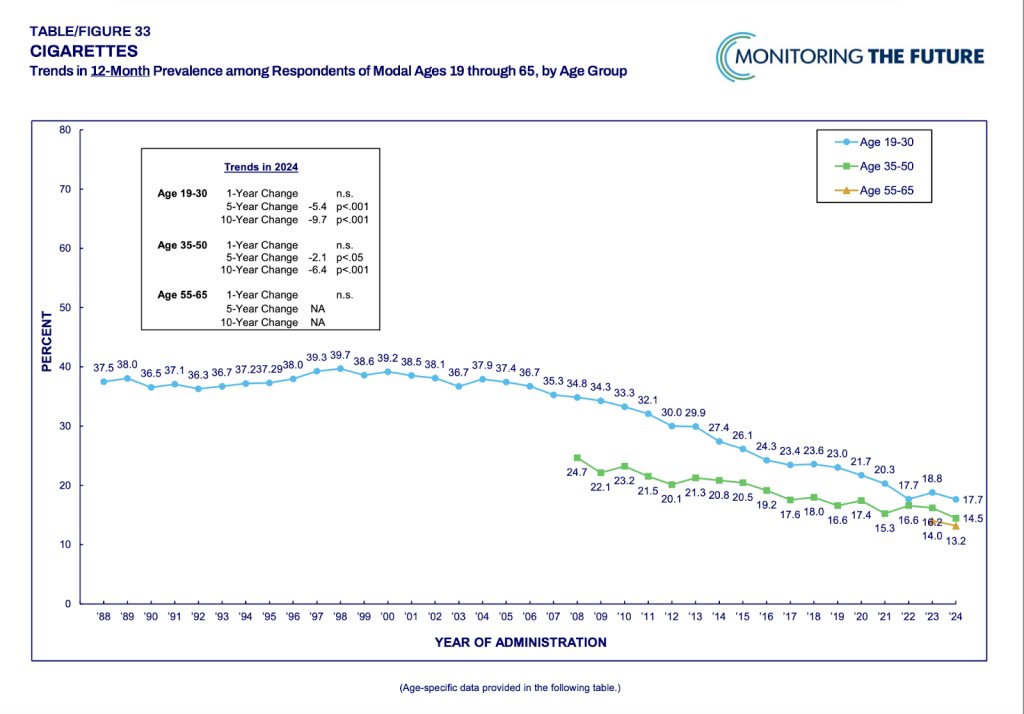 Le tendenze non si limitano ai giovani. Anche gli adulti nella prima metà della vita (tra i 35 e i 50 anni) hanno registrato un netto calo del fumo. Il consumo di sigarette negli ultimi 12 mesi è sceso dal 20,8% nel 2014 al 14,5% nel 2024, mentre il consumo negli ultimi 30 giorni è sceso dal 16,3% al 10,7%.