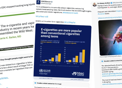 Po raz kolejny, Community Notes było pod ręką, aby poprawić błąd, wskazując, że tego rodzaju urazy płuc są związane z wapowaniem marihuany, a nie nikotyny.